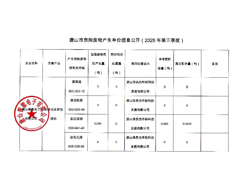 唐山智能電子有限公司2025年第三季度信息公開(kāi)